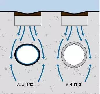 塑料管屬于柔性管,在受外壓負荷時,柔性管和剛性管的承受負載的機理是全部不同的。柔性管在受壓破壞之前,可以有較大的變形,而剛性管在受外壓破壞之前不可能有較大變形。當(dāng)剛性管受外壓時,負載全部經(jīng)過管材壁傳遞到底部的管床上,在管材壁內(nèi)產(chǎn)生彎矩,隨著管材直徑加大,管壁的彎矩和應(yīng)力急劇加大,所以大直徑的混凝土排水管常常需加鋼筋,而柔性管在受壓破壞前先變形----橫向外擴,管材周圍的回填土壤可以起到阻止柔性管變形和外擴的作用,外壓負載就被傳遞和分攤到周圍的回填土中去了。所以,在同樣外壓負載下柔性管管壁內(nèi)的應(yīng)力較小,它和周圍的回填土共同承受負載,管土共同作用。因此,塑料埋地排水管不需和剛性混凝土管一樣的強度和剛度,在合理的剛度下,是全部可以達到使用要求的,這一點已被歐洲發(fā)達的應(yīng)用實踐所證明。